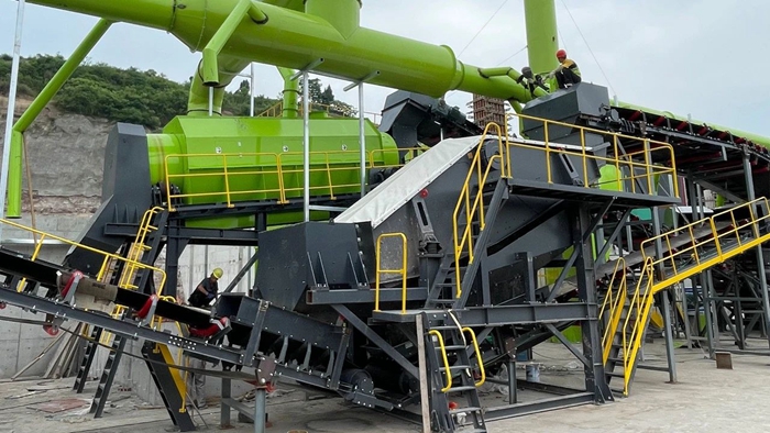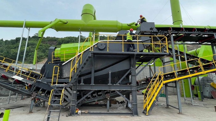 核心設(shè)備:鵝頸式輕型板喂機(jī)和中型板喂機(jī),全密封輸送帶,負(fù)壓臥式風(fēng)選機(jī)、階梯棒條篩、人工+智能化機(jī)器人聯(lián)合分揀平臺(tái)、雙軸撕裂機(jī)、除鐵器、除塵器等。